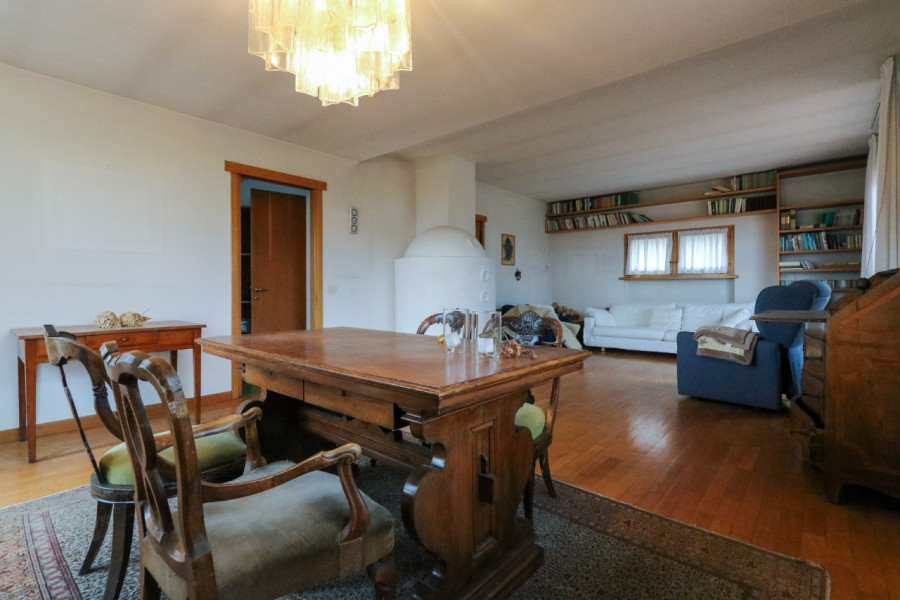 L’ingresso conduce al piano terra dove si sviluppa la zona giorno: una cucina abitabile, un ampio salone impreziosito dalla presenza della stube e con accesso diretto al giardino, ideale per godersi gli spazi all’aperto durante la bella stagione. Sullo stesso livello troviamo anche un pratico ripostiglio finestrato e un bagno di servizio.
